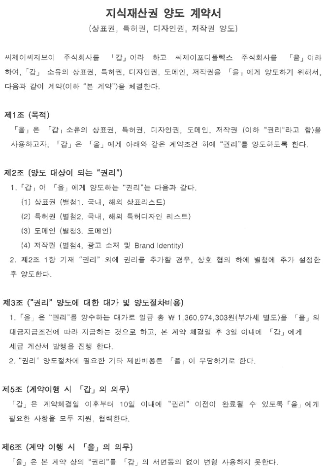 CJCGV株式會社(以下簡稱甲方)與CJ4DPLEX株式會社(以下簡稱乙方)針對甲方所有的商標權、專利權、設計權、域名、著作權向乙方的轉讓事宜,簽訂如下協議(以下簡稱本協議)。