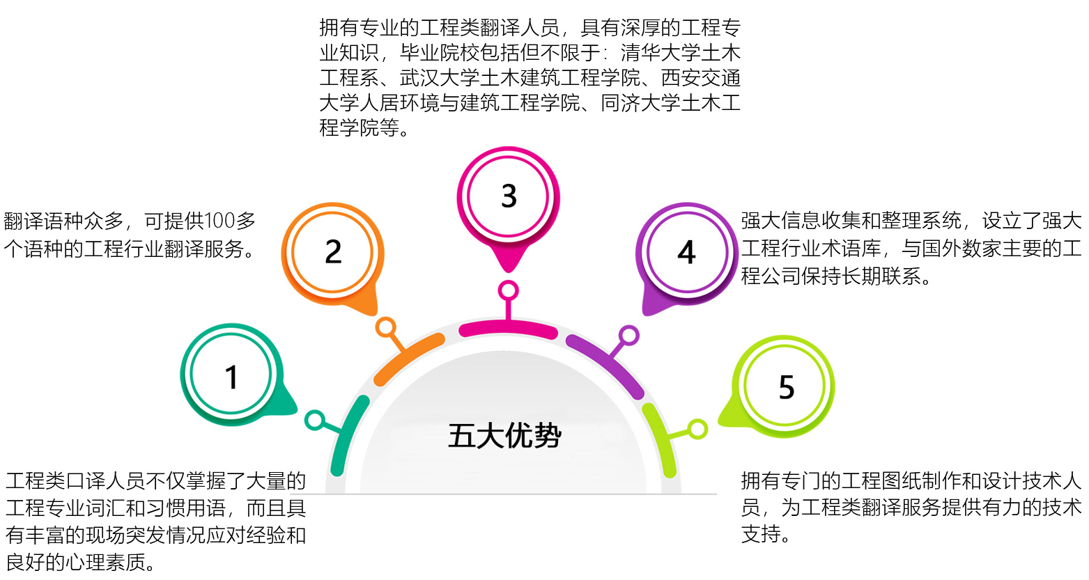 多語種的工程類口譯服務,涉及:現場施工與設備安裝交流、海外工程項目人員外派服務、技術交流會、工程商務談判、工程行業大會、出國項目考察、工程技術培訓等。